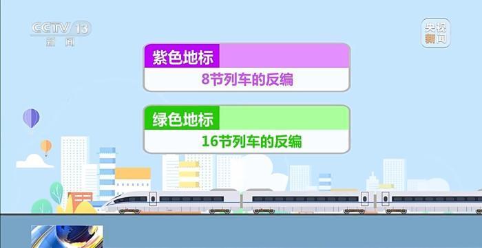 另外,站台地面上的这些彩色地标也会让您候车更方便。蓝色、黄色分别代表8节和16节编组列车的正编,也就是动车组列车前进方向的第1节车厢为1号车厢,车厢号从小到大以此类推。紫色和绿色地标代表相应反编列车车厢。